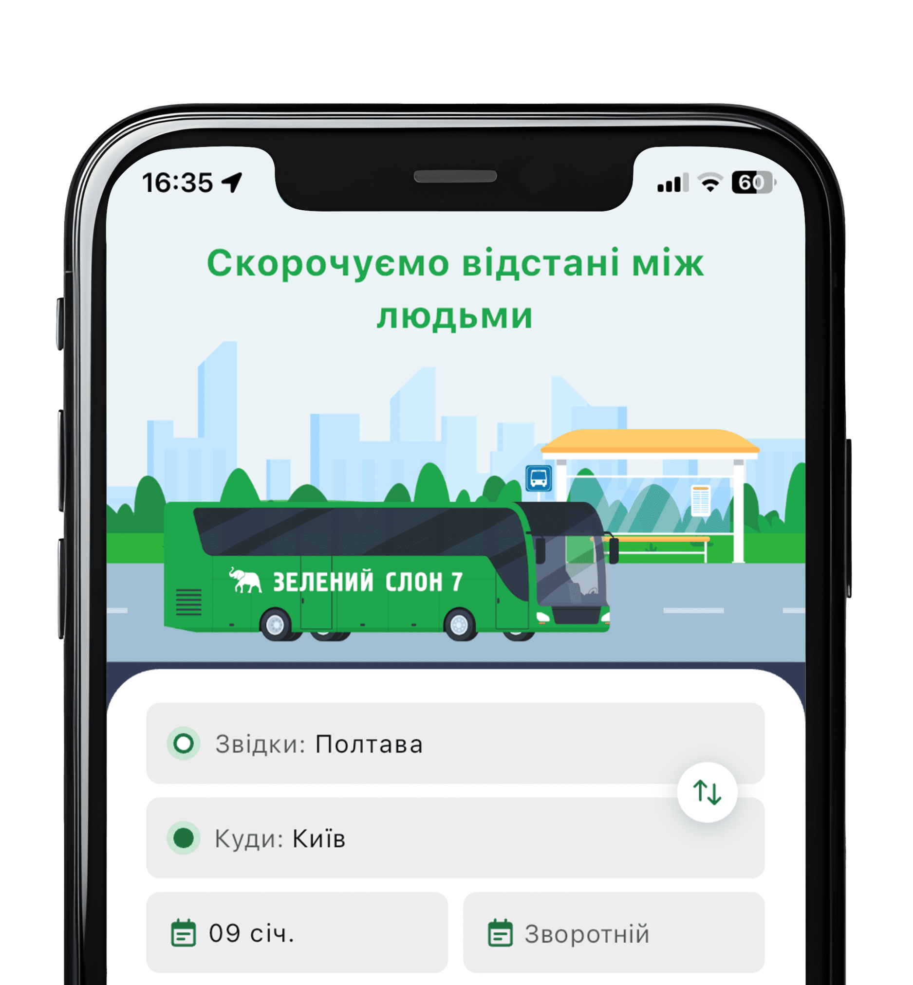 - Цілодобова підтримка: мобільний додаток, сайт та Команда Турботи Зелений Слон 7 працюють цілодобово. Бронюйте квитки коли вам зручно. У разі труднощів або питань наша Команда Турботи прийде на допомогу 24/7.